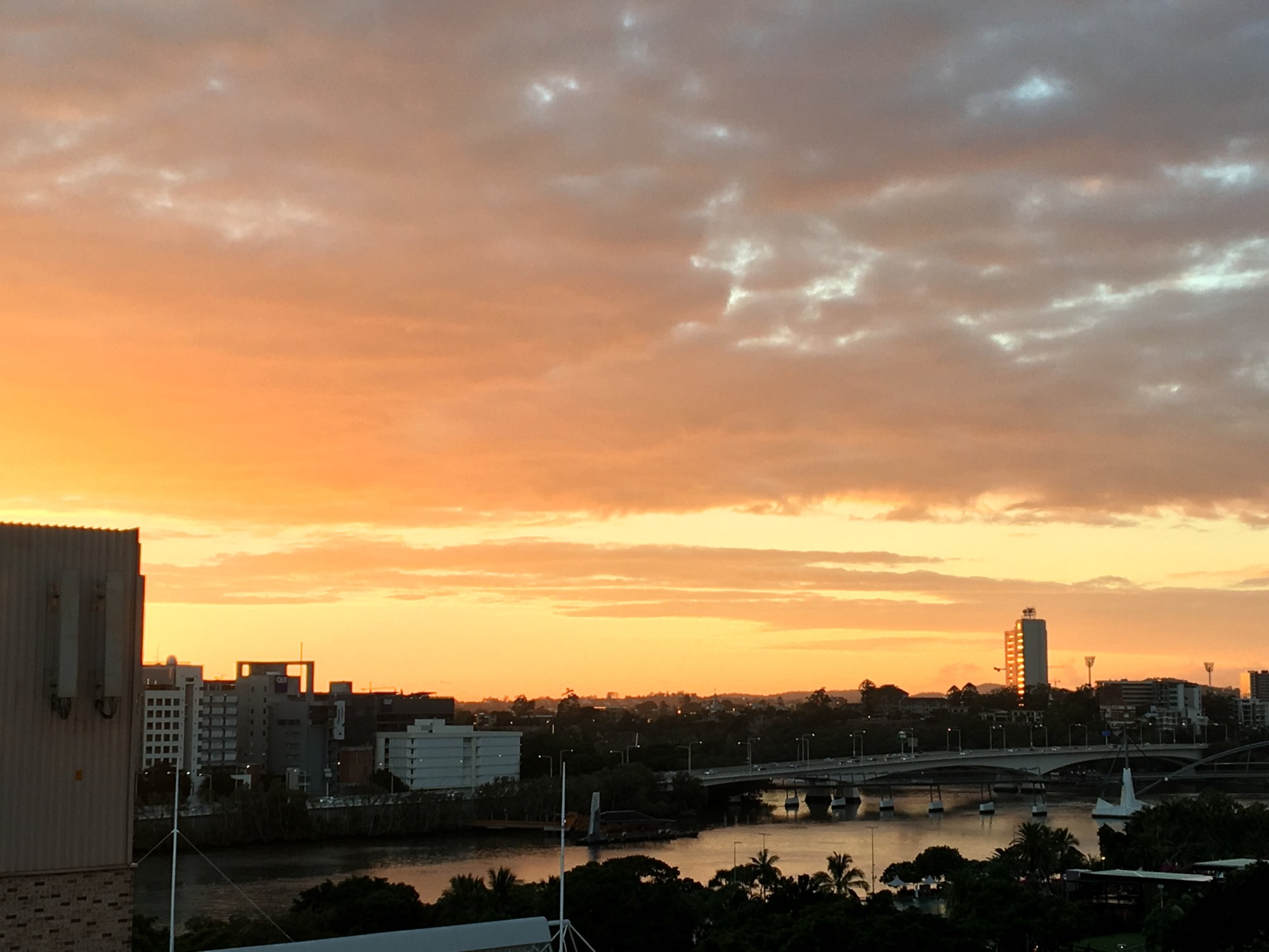 –The picture today is dawn this morning over Brisbane where I’ve come to work hard and, hopefully, to rest, though the massive cyclone bearing down on northern Australia is a little concerning…